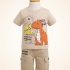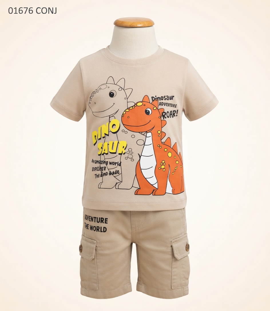 Detalles que enamoran: ✅ Camiseta en color beige arena con estampado frontal grande y full color ✅ Dos dinosaurios simpáticos: un T-Rex naranja sonriente y un dinosaurio gris ✅ Textos divertidos en amarillo y negro: “DINO SAUR”, “Dinosaur ADVENTURE ROAR!” y “An amazing world explorer – The dino dude” ✅ Short cargo en beige combinando perfectamente con la camiseta ✅ Bolsillos cargo laterales con botones funcionales ✅ Cintura elástica con botón para un ajuste cómodo ✅ Detalle de texto “ADVENTURE THE WORLD” en las piernas