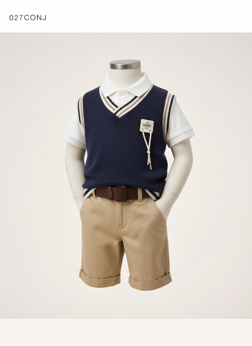 Comodidad nivel máximo ☁️ Este conjunto combina estilo sofisticado con gran comodidad. El chaleco knit es suave y ligero, el polo de algodón piqué es fresco y transpirable, y el short de algodón twill permite total libertad de movimiento. Todo el set es suave al tacto, no irrita la piel y es ideal para usar varias horas sin que tu niño se sienta incómodo. La cintura del short es cómoda y el corte permite agacharse, correr y jugar sin problemas.
