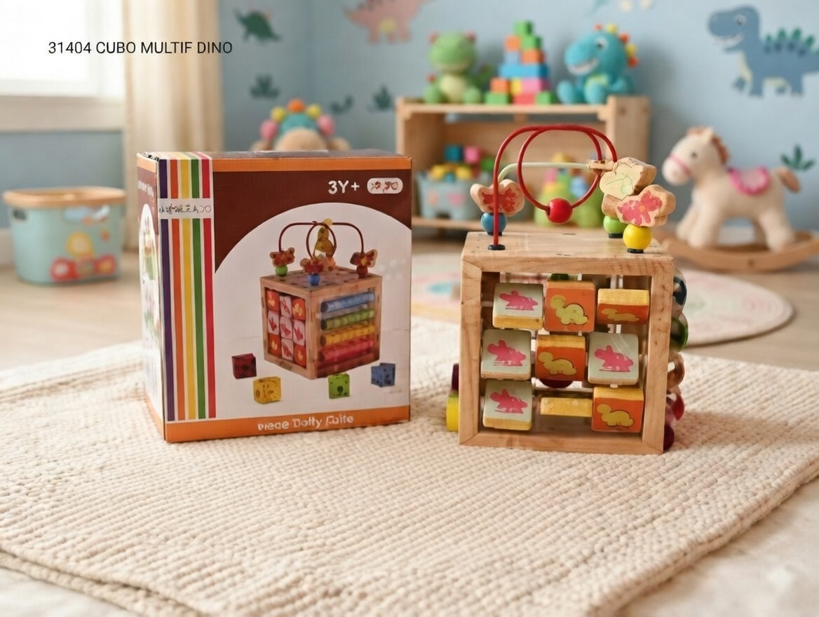 La Cubo Multifuncional Dino (Referencia 31404 CUBO MULTIF DINO) es un juguete educativo de madera 100% natural y diseño temático de dinosaurios, perfecto para niños a partir de 3 años (3Y+). Se trata de un cubo de actividades multifunción (busy cube) que combina varias estaciones de juego en un solo objeto compacto y duradero, ideal para estimular el desarrollo integral mientras los peques exploran el fascinante mundo de los dinosaurios 🦕.