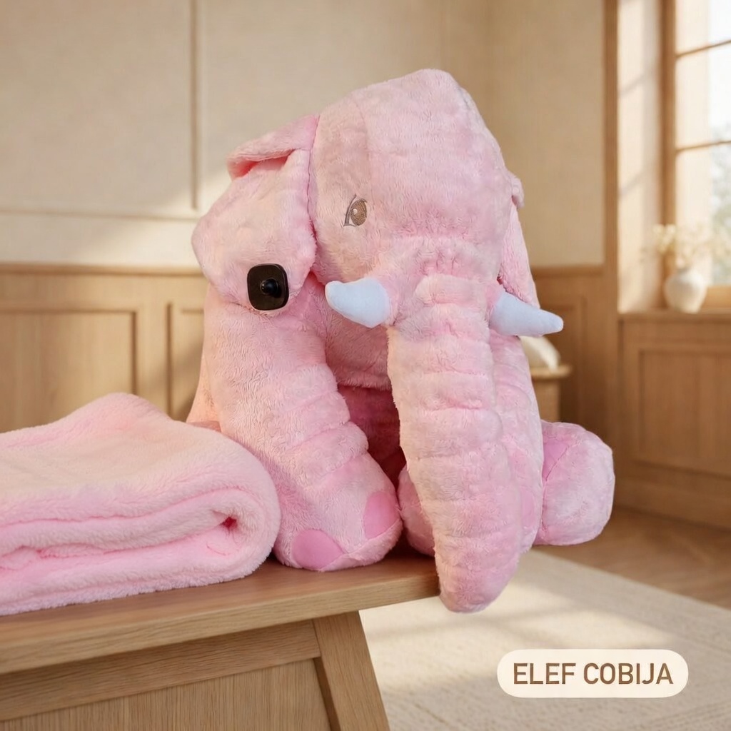 Es un adorable elefante de peluche gigante color rosa suave, diseñado como un compañero tierno y funcional para los más pequeños (y no tan pequeños).