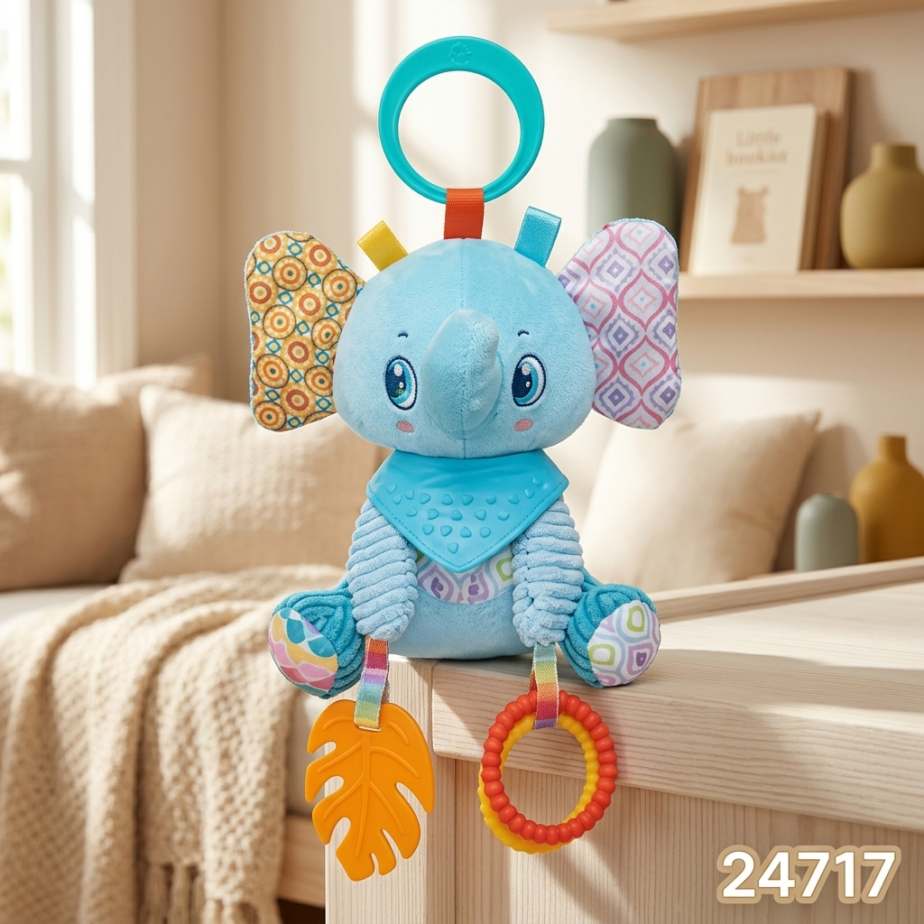 Este es un sonajero de peluche sensorial diseñado para la estimulación temprana de bebés (0 a 24 meses). El modelo específico combina funciones de juguete de apego, mordedor y sonajero.