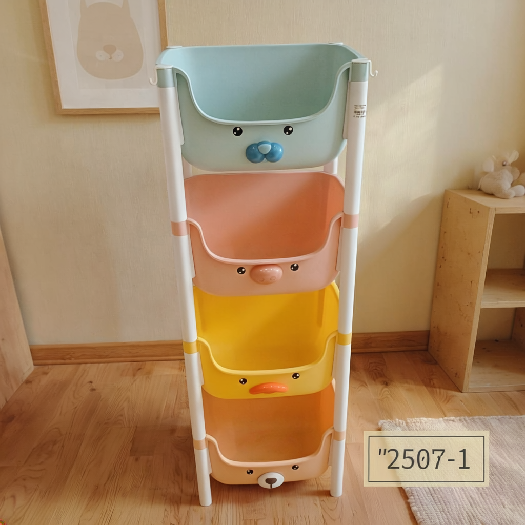 Es un organizador vertical de plástico diseñado principalmente para niños o espacios infantiles. Tiene una estructura ligera con cuatro compartimentos apilados en forma de bandejas abiertas, ideales para guardar juguetes, libros, ropa u otros objetos pequeños.