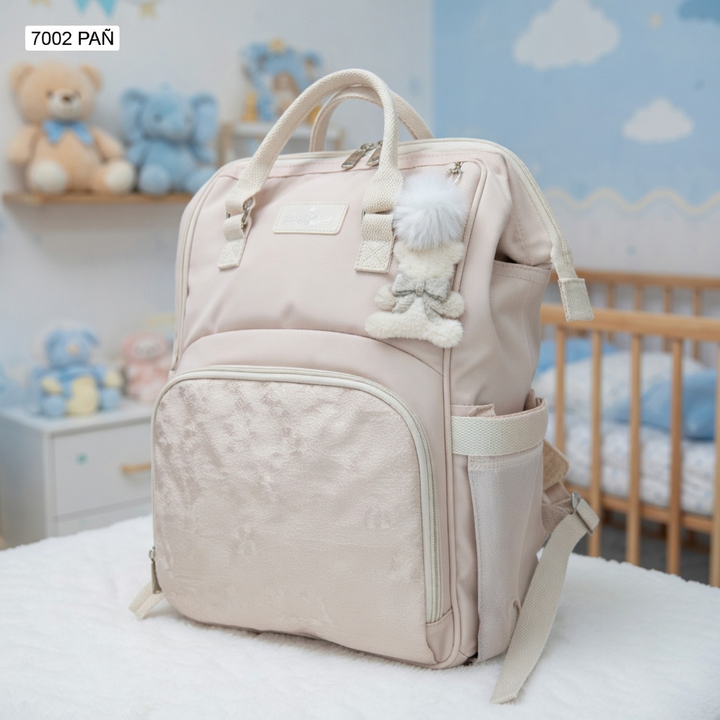 La mochila pañalera Baby Luna modelo 7002 PAÑ es una opción premium y adorable para padres que buscan combinar elegancia, suavidad y máxima practicidad en el día a día con bebé. Su diseño en tono beige claro con textura acolchada o bordada sutil, detalles en crema y el charm decorativo de pompón con osito y moñito la hacen lucir sofisticada y moderna, perfecta para mamás y papás que quieren estilo sin sacrificar funcionalidad.