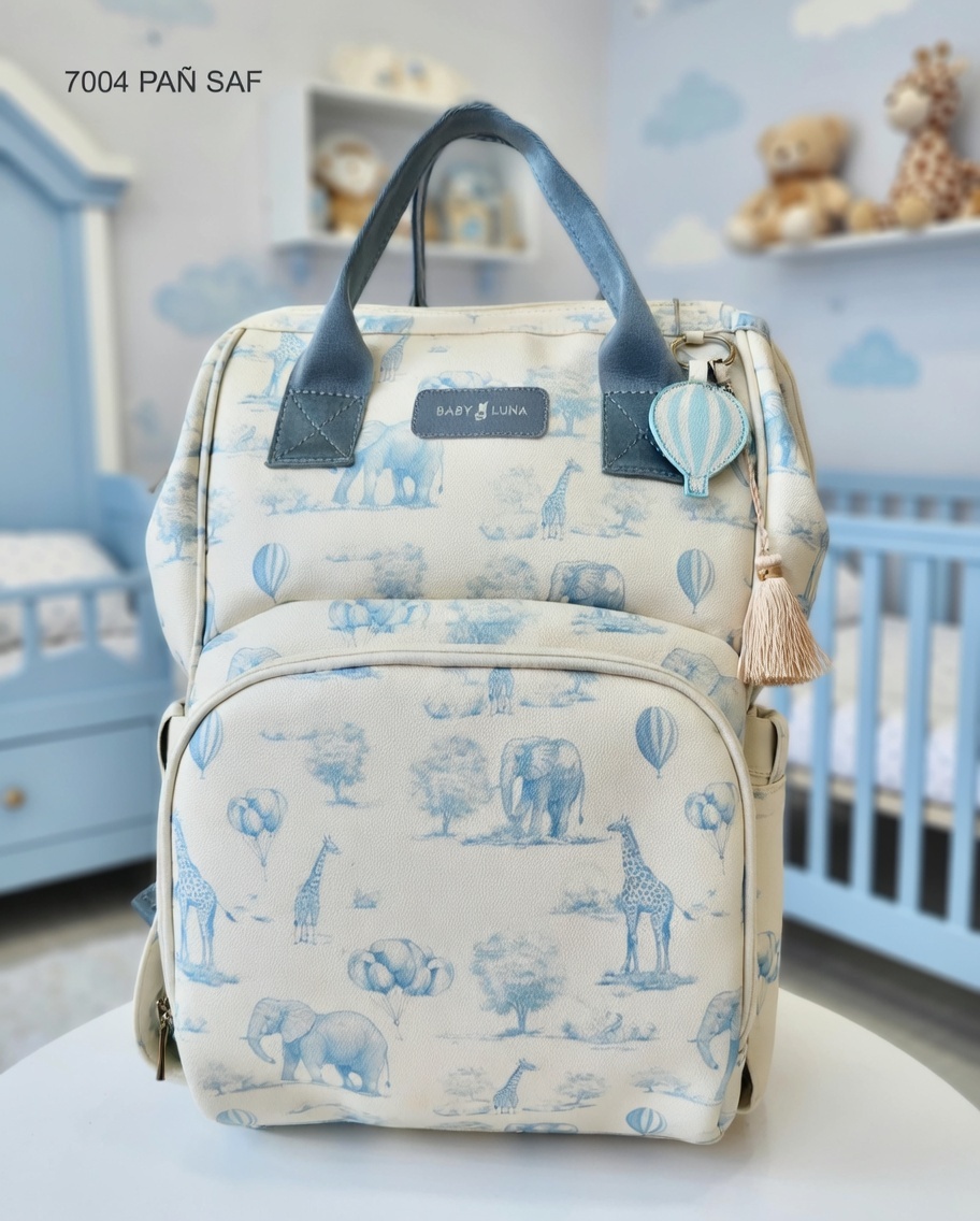 ¡Estilo safari azul sereno con estampado de elefantes, jirafas y globos, combinando elegancia y funcionalidad! 🍼🦒