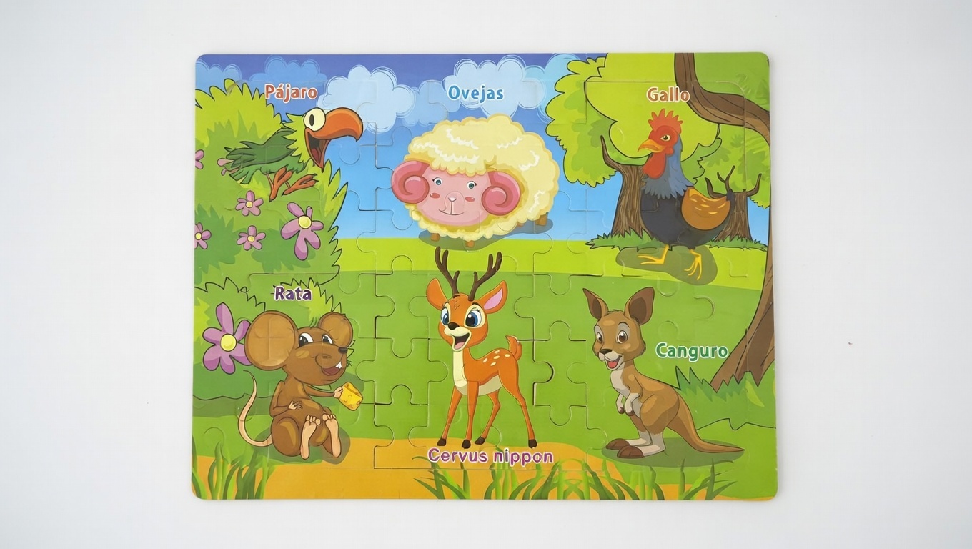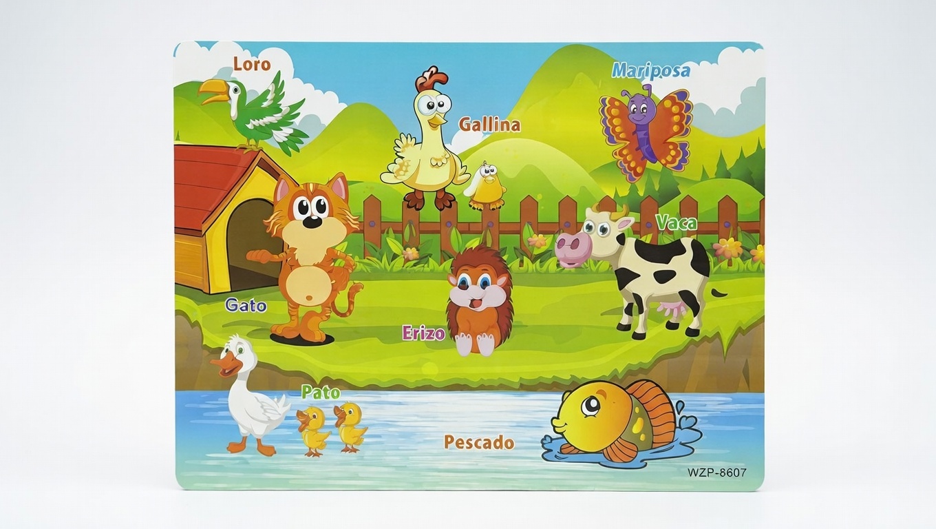 Este colorido rompecabezas presenta ilustraciones llamativas de animales de la granja como la gallina, el gallo, la vaca, la cabra, el gato y el conejo, ayudando a los pequeños a familiarizarse con el entorno rural mientras desarrollan habilidades cognitivas.