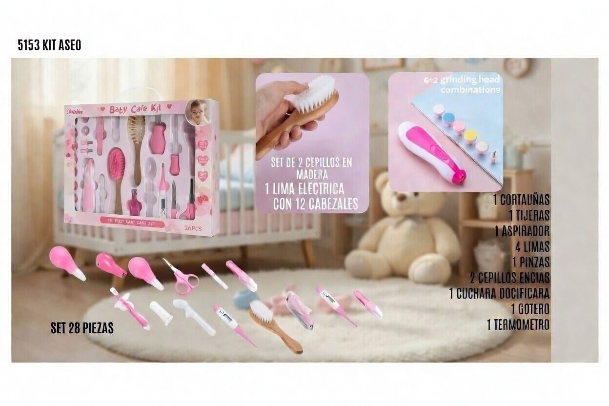 ¡Transforma el cuidado diario de tu bebé en un ritual de amor y seguridad con nuestro Kit de Aseo Bebé Completo (Ref. 5153 KIT ASEO)! 🌟 Este set de 28 piezas es el aliado perfecto para mamás primerizas y expertas, con todo lo que necesitas para el grooming, salud y bienestar de tu pequeño desde el nacimiento hasta los primeros años. ¡Práctico, seguro y adorable, diseñado para hacer tu vida más fácil!