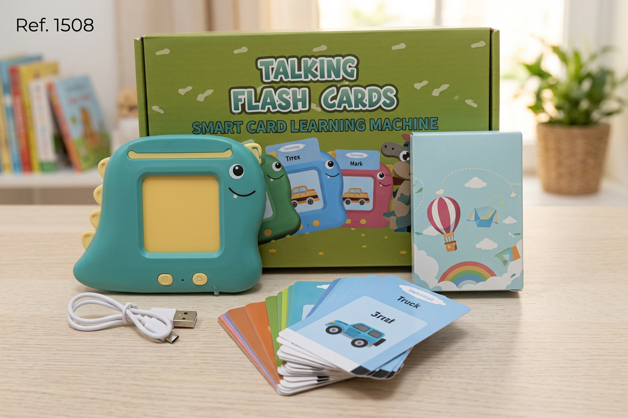 Esta Máquina de Tarjetas Parlantes (Talking Flash Cards) con diseño de dinosaurio es una herramienta interactiva diseñada para acelerar el aprendizaje del lenguaje y el vocabulario en los niños de forma divertida.