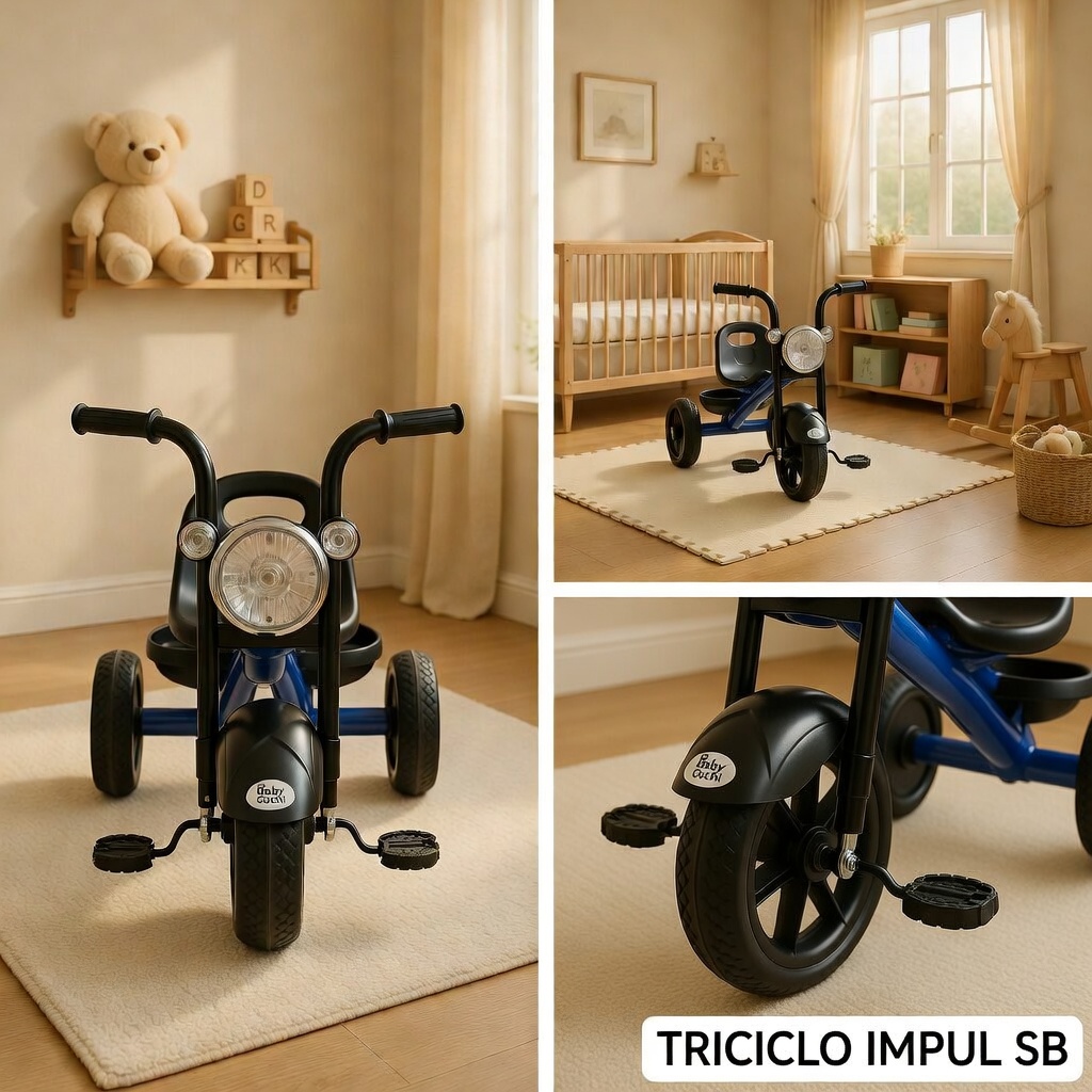 El Triciclo Impuls SB es un vehículo infantil robusto y divertido, diseñado especialmente para niños en etapa de motricidad gruesa. Con su estilo moderno tipo moto, faro delantero y manubrio alto, este triciclo captura la atención de los niños mientras les ayuda a desarrollar equilibrio, coordinación y fuerza en las piernas.
